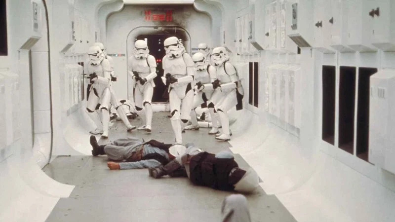 Right at the start, the film throws you into chaos as Darth Vader’s forces storm Princess Leia’s ship, the Tantive IV. The white-armored stormtroopers blast through the door, mowing down rebels with ruthless precision, setting a tone of high stakes and danger.