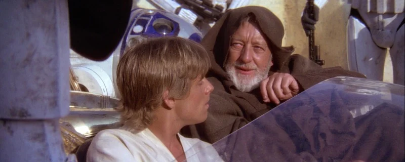 Obi-Wan Kenobi faces Darth Vader in a lightsaber duel, only to let Vader strike him down. As Luke watches, Obi-Wan vanishes, leaving only his robe behind, with his voice later guiding Luke.