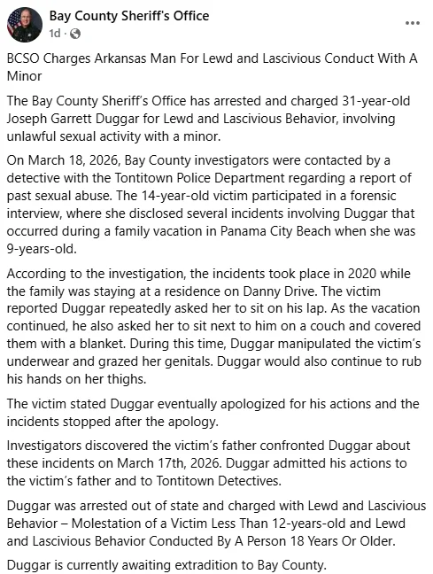 The Bay County Sheriff’s Office in Florida released a public statement on Wednesday, March 18, confirming the charges. Duggar is accused of lewd and lascivious behavior, specifically molestation of a victim under the age of 12 and inappropriate conduct by an adult.