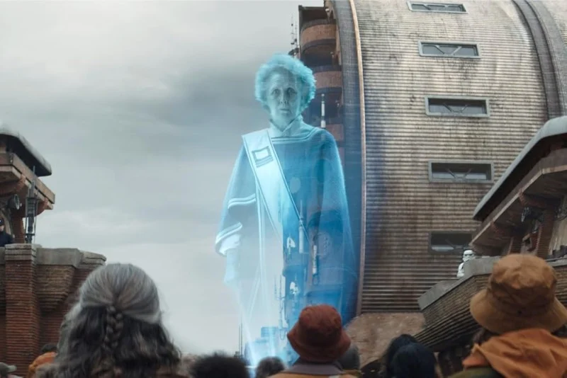 Episode 12 brings the Ferrix funeral procession that begins with the anvil and a marching band through the streets. A hologram from Maarva’s brick urges residents to resist and a crowd surges as Wilmon Paak’s device explodes and fighting spreads across the square.