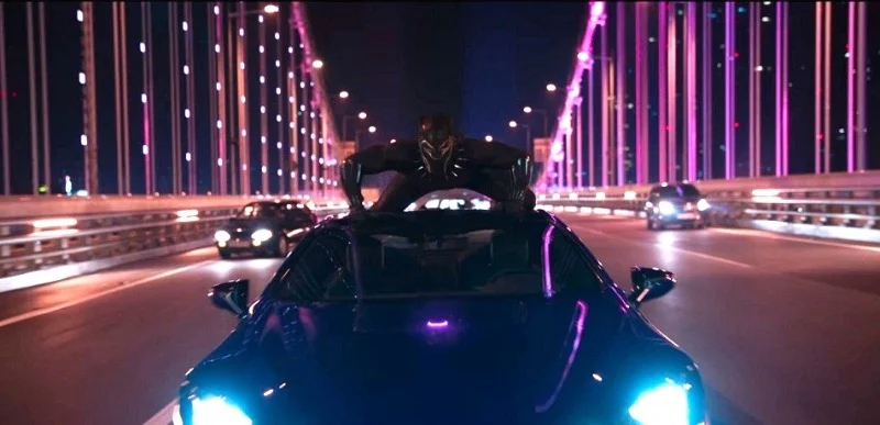 As T’Challa rides on the roof of the sports car, his landing creates visible dents and scratches. In some cuts those impressions look deeper and spread, and in others the same roof section looks cleaner with fewer marks than the previous shot.