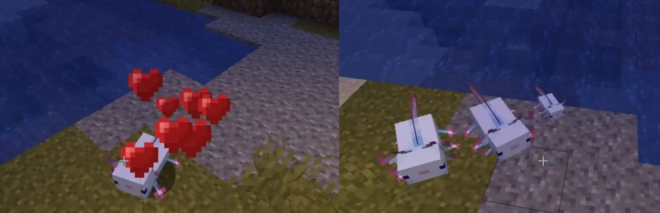 - Hearts will appear over axolotl heads, and you will see another axolotl spawning near themÂ