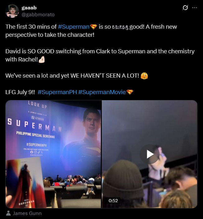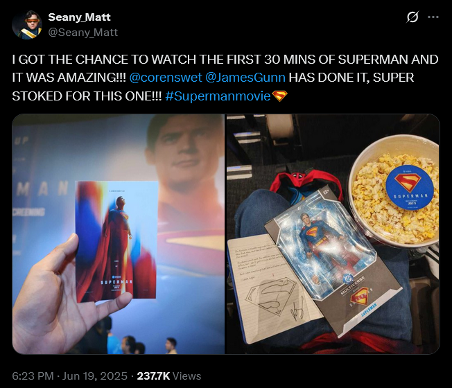 Someone else posted, “I GOT THE CHANCE TO WATCH THE FIRST 30 MINS OF SUPERMAN AND IT WAS AMAZING!!! @corenswet @JamesGunn HAS DONE IT, SUPER STOKED FOR THIS ONE!!!”