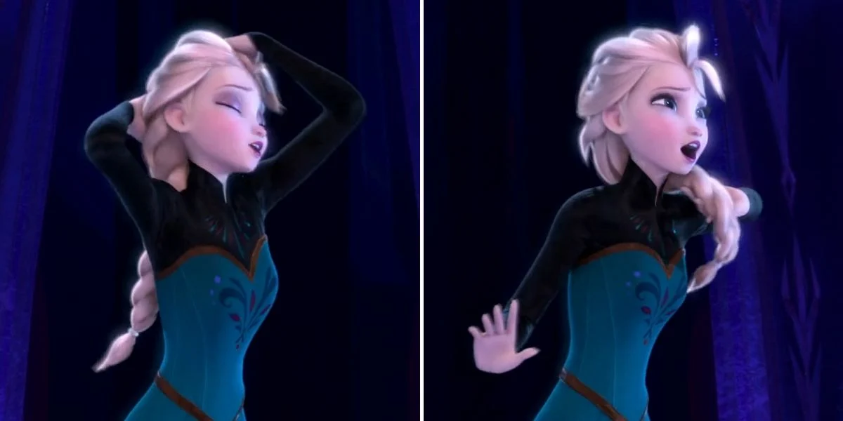 During the ‘Let It Go’ sequence, Elsa pulls her loose hair into a braid and swings it from behind her back to over her shoulder, but the braid passes straight through her shoulder instead of flipping over it. This is an example of a common CG issue called geometry “clipping,” where one 3D object intersects another instead of colliding realistically. Elsa’s hair was famously complex, with hundreds of thousands of individual strands driven by advanced simulation tools, which increases the chance of intersections like this in fast movements. Animators sometimes choose a minor intersection rather than risk breaking a shot’s performance, especially in a big musical moment. In interviews and fan discussions, people working with the film’s assets have even explained that the controls for her hair, dress, and body made it easier to accept the intersection and frame it so most viewers wouldn’t notice.