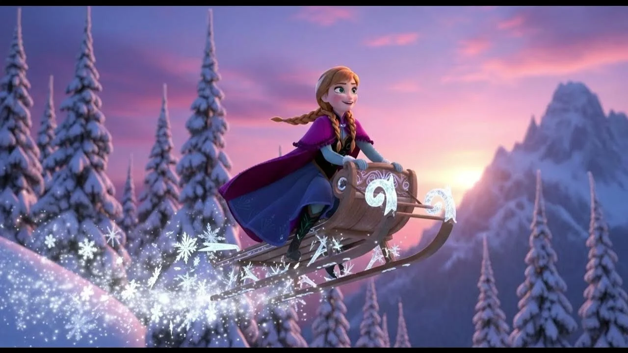 During the wolf chase, Anna and Kristoff are roped together on the sled as they race across the snowy landscape. When they crash and fall off the cliff, several shots clearly show the rope still tying them as they tumble through the air. Once they land in the snow, however, that rope is suddenly gone, and neither character has to untie or remove it. This kind of continuity problem often happens when action scenes are storyboarded for drama first and only later checked for prop consistency. Because each shot is animated separately, a missing element like a rope can vanish if it is not consistently tracked in the layout and animation notes.