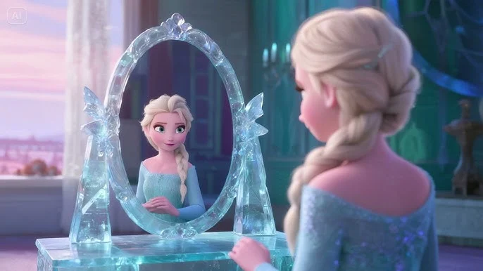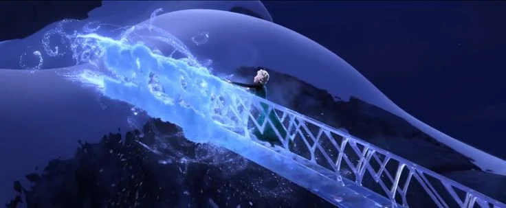 Inside Elsa’s ice castle, Anna climbs an ice staircase flanked by large pillars and walls of ice that act like mirrors. At one point, Anna’s reflection appears to face the camera almost straight-on, even though the reflective surface is off to her side, which doesn’t match how a real mirror would reflect her. Reflections in CG are generated by the rendering engine, but artists can tweak surfaces and shading so characters remain visible and appealing. In tight spaces, they may choose a reflection angle that keeps facial expressions readable rather than obeying precise ray-tracing geometry. This means the ice sometimes acts like an idealized mirror that favors character visibility and composition over physically perfect optics.