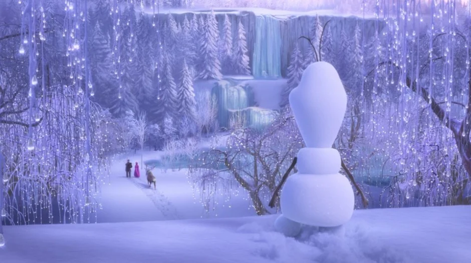 When Marshmallow chases the group off the cliff, Olaf, Anna, and Kristoff fall in a very clear order: Olaf first, Anna second, and Kristoff last. At the bottom, Anna has created a big mound of loose snow where she lands, but Kristoff somehow ends up buried under smooth, untouched snow beneath Olaf. This arrangement doesn’t match the fall order or the way snow would realistically pile up from multiple impacts. Effects animation for snow focuses on making collapses, sprays, and cushions look visually pleasing within each shot. Because each character’s landing is animated for maximum clarity and humor, the exact physical relationship between the three landings is less strictly simulated, which produces this odd final configuration.
