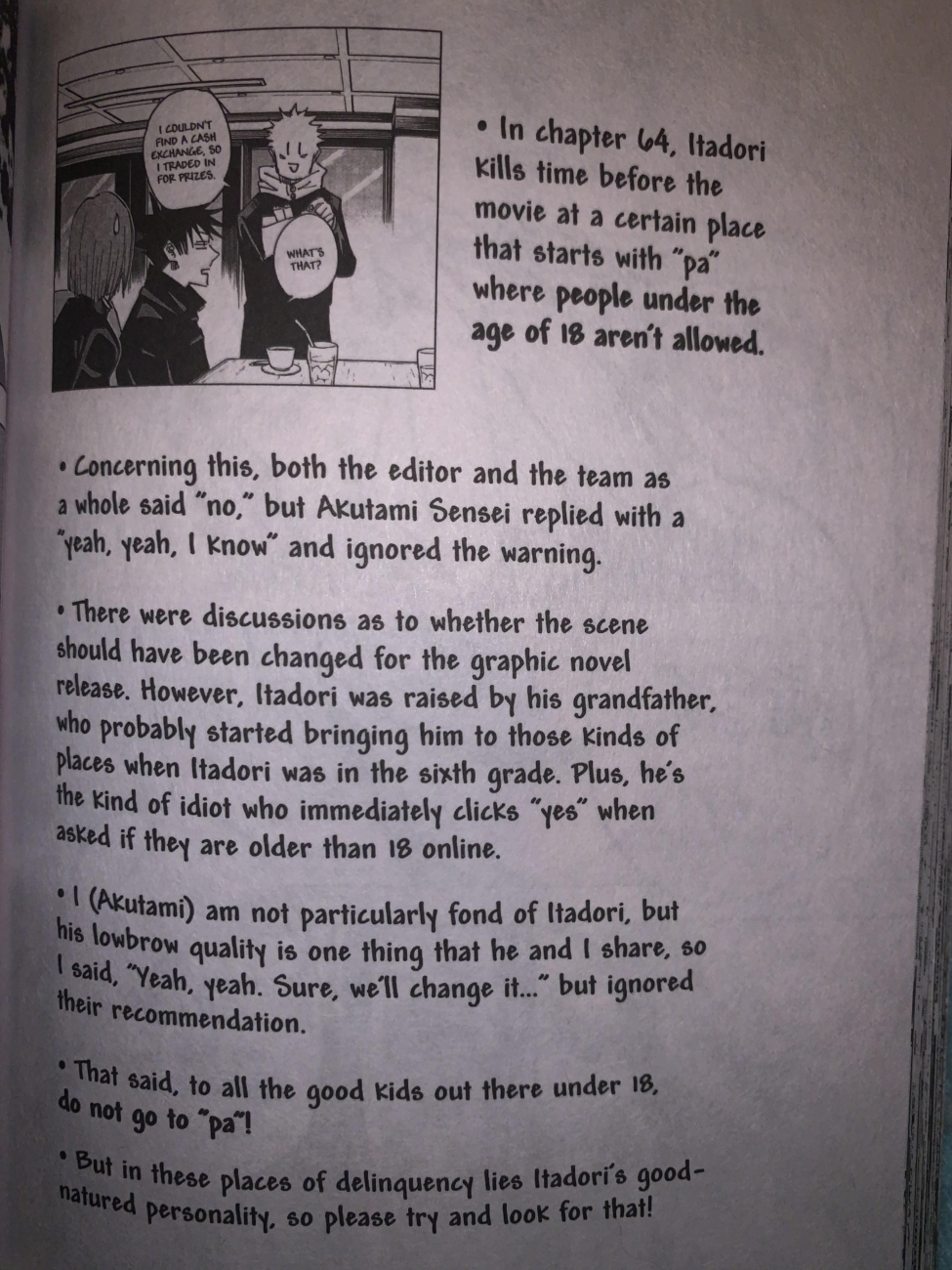 This is a scan from the printed edition of the manga, which includes some authorial comments by Gege Akutami. As you can see here while referring to the “infamous” “PA” scene, Akutami explained that he was aware that he wrote a relatively inappropriate scene (although his going to a “PA” is far less troublesome than some of the scenes in the manga), but he decided to leave it despite his editor’s insistence simply because he did not care too much for Yuji.