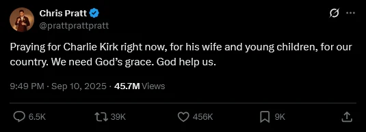 On September 10, Pratt shared a post on X writing, “I am praying for Charlie and his wife, young children, and our country. We need God’s grace. God, help us.”