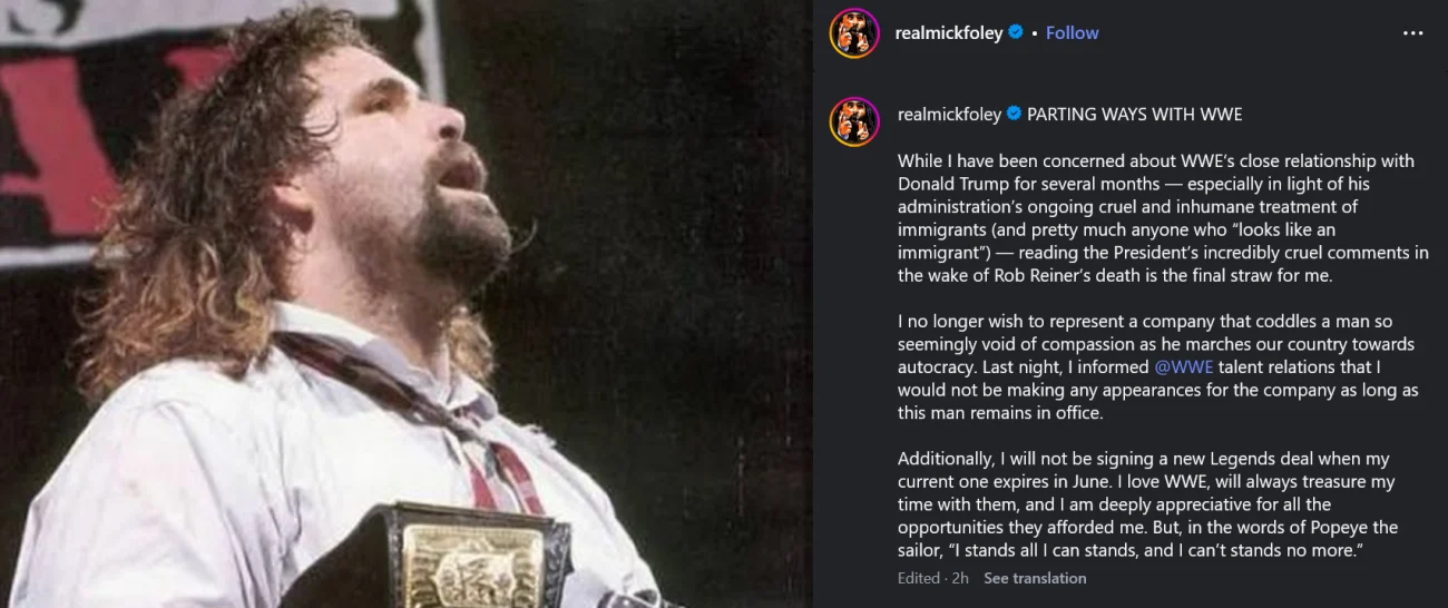 WWE Hall of Famer Mick Foley has officially cut ties with the company, citing President Donald Trump’s recent comments about the late filmmaker Rob Reiner as the breaking point.