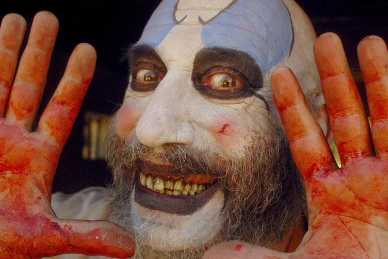 Captain Spaulding features in Rob Zombie’s ‘House of 1000 Corpses’, ‘The Devil’s Rejects’, and ‘3 from Hell’, portrayed by Sid Haig. He is presented as a roadside attraction owner with an iconography that includes greasepaint, a patriotic palette, and a carnival barker persona that ties the films together.