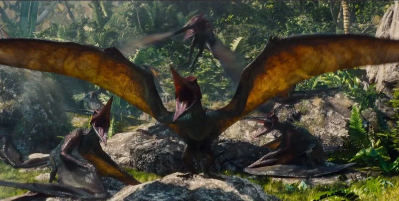 When the park’s flying dinosaurs, the Pteranodons, break free, they swarm the crowded main plaza. Visitors scream as the winged beasts swoop down, snatching people into the air.