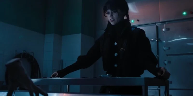 Wednesday’s knack for the macabre shines when she sneaks into Jericho’s morgue to investigate. Hiding in a mortuary refrigerator, she fools Dr. Anwar into thinking she’s a corpse, lying still and cold.