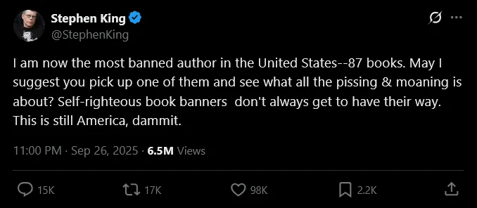 The legendary author spoke out on X, criticizing the people responsible for restricting access to his work. He urged critics not to complain about his books, but to simply pick one up and read it.