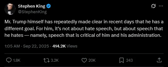 Stephen King Criticizes Trump Due to Charlie Kirk Memorial Speech, Gives Him a New Nickname