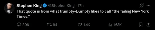 In a separate post, King also gave Trump a new nickname, referring to him as “trumpty-Dumpty” while mocking the president’s description of the New York Times as “the failing New York Times.” Fans quickly reacted to King’s remarks with support on social media.