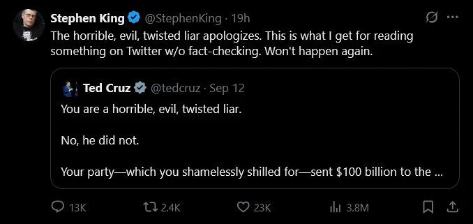 King’s post sparked widespread criticism, particularly from conservatives. Texas Senator Ted Cruz called the author a “horrible, evil, twisted liar.” King responded to Cruz on social media, “The horrible, evil, twisted liar apologizes. This is what I get for reading something on Twitter [without] fact-checking. Won’t happen again.”
