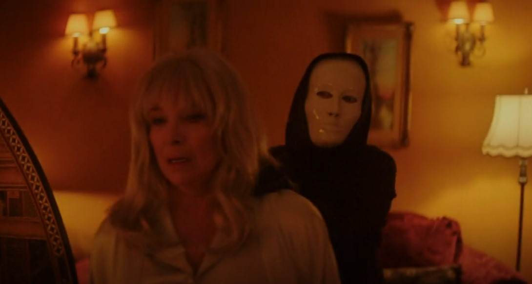The wife is soon attacked by the stranger and led upstairs at gunpoint, the masked stranger tries to calm the woman down to stop her from screaming and promises to explain everything if she just keeps silent. The wife calms down and at that moment, the stranger shoots her in the head point blank using a pillow as a silencer. The plot twist is obvious when the masked stranger takes down her mask and we can see that the person who killed the older woman is her identical twin. The killer disposes of the body quickly and returns to the husband upstairs. The husband can’t tell the difference between his deceased wife and this “stranger” now snuggling up to him in the bed.