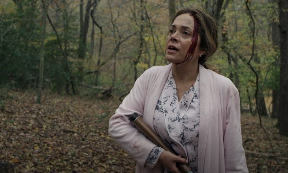 Dawn has already started breaking outside, and Juliette is on the run in the forest in her sleeping robe and slippers. She is basically playing hide and seek with Casey and Belle, and this is probably the worst sequence in the movie. For some reason, Casey and Belle don’t hear all the noise that Juliette is making while running away, and Juliette, for some reason, decides to continue running in her slippers. But in any case, at some point, Juliette hides in the shed. Casey runs after her, and she smacks him in the face with a shovel – she smacks him instead of going for the kill, and she runs away once again.