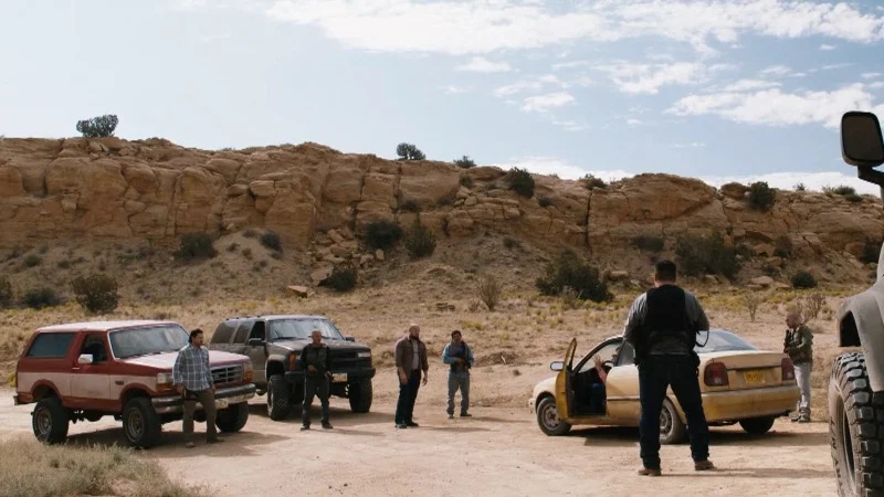 The ambush during the money pickup leaves burned vehicles and a large number of spent casings in a remote area. Jimmy and Mike traverse the desert with visible injuries and carry bags that were part of a major cartel transfer. The show presents no detailed follow up from local or federal agencies on ballistic evidence or missing currency flagged by financial surveillance.