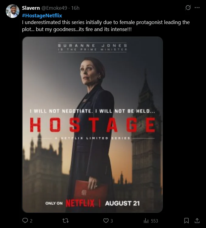 Netflix has just released a new British political thriller miniseries called Hostage, starring Suranne Jones and Julie Delpy as the British Prime Minister and the French President. The show premiered on August 21, 2025, and fans have already taken to social media to praise it.