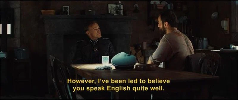 Characters switch between French, German, English, and Italian to conceal or expose information during critical scenes. Hans Landa changes languages mid conversation to limit eavesdropping, and the basement tavern sequence tests whether a British officer can pass as a native speaker.